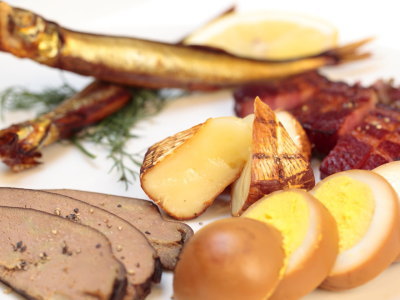 熊五郎の手作り燻製。リンゴの木のチップを使った香り高い燻製です。
